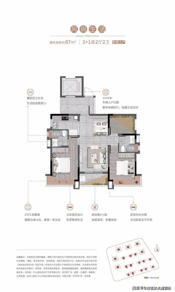 越秀天樾湾有诸多房屋户型挑选,从建面约85平到122平,从三室到四室,应有尽有。建面约87平带主套3房,专梯入戶,既隐秘又高贵。我们知道,专梯入戶通常情况下是一百四十㎡之上大户型房型图的特享,而在天樾湾,建面约87㎡的房屋户型就可以具有一梯一户的配置!