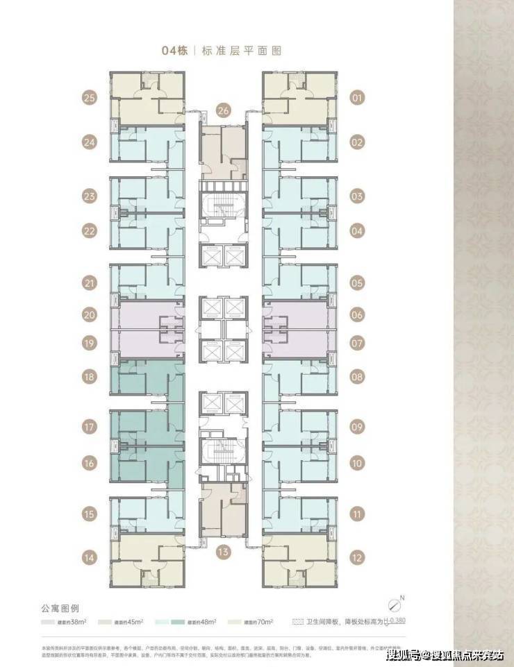 住宅由4栋48层建筑组成,分别是1栋、2栋1/2单元和3栋,3梯5/6户,4栋是商务公寓45F(1470户),5栋是幼儿园。