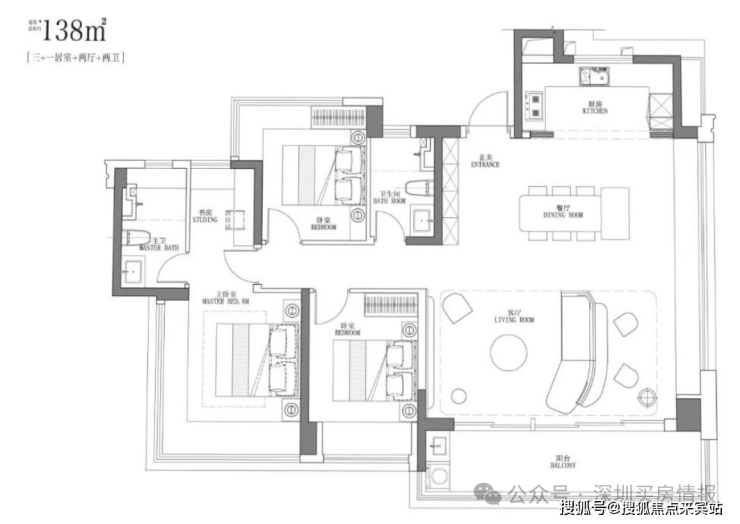 竖厅南北通透格局,进门入户玄关,客厅4.3米开间,餐客厅分离设计,四开间朝南,全屋八面飘窗,主卧做到了270度转角无柱飘窗,U型厨房,卫生间干湿分离,得房率约95.2%(包含赠送),客厅连接次卧出7.1米长的观景大阳台,全部主朝西南向,看大运公园景观。