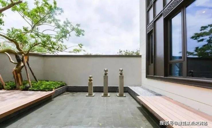 合院采用岭南设计风格,270°风光围合,用石材铺装,以草坪加灌木、乔木的方式创造出了多重立体植物的庭院空间,以石柱、月洞门等景观小品加以点缀。