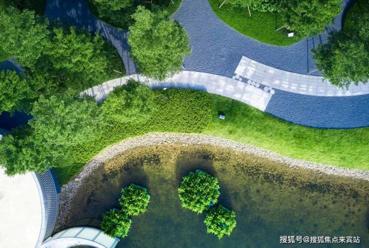 在水景的营造上,为了突出池水整体通透清澈的感觉,自然种植在区域内点缀搭配,颇有自然山林之感,透露儒雅的气息,呈现出理想中的美感。