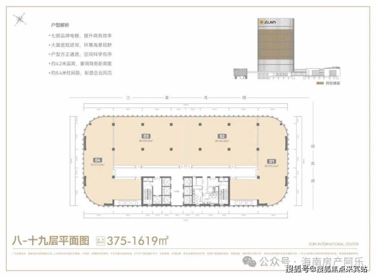 建面约303-732㎡滨海创意空间,约4.5-5.4米阔绰层高,格局方正通透,可根据需求自由创享。建面约375-1619㎡ 云端总部办公,约4.2米奢阔层高,约8.4米柱间距,180°全海景视野。