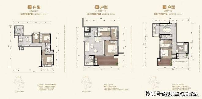 精装刚需户型:82-88㎡三房两厅两卫:三梯六户设计,精装交付,南向或西南向,双阳台配置,主卧带独立衣帽间,得房率约82%。