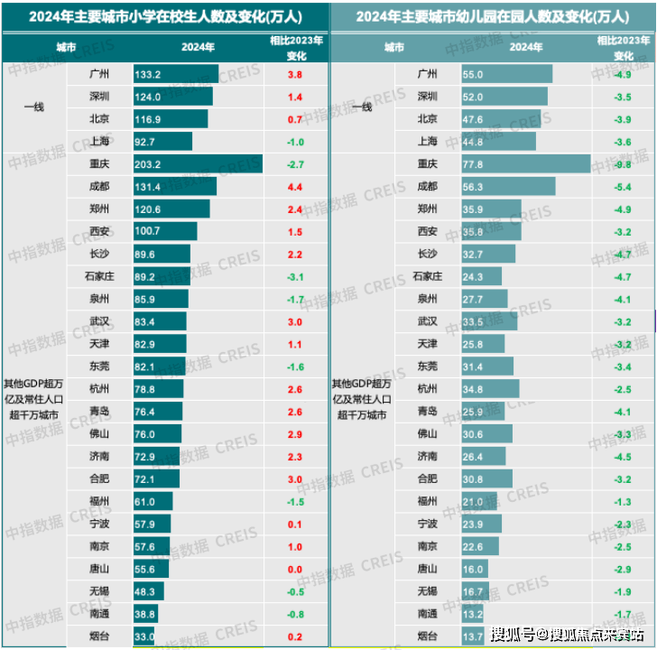 从对房地产的影响角度来看,在园幼儿和小学生规模大意味着城市拥有更多的年轻家庭,随着孩子成长过程中对居住空间需求的变化,更多改善性购房需求将得到释放,进而对城市房地产市场形成更强的支撑。其中,一线城市在较大人口基础上,在园幼儿及小学生规模均较大,广州、深圳在园幼儿均超50万,小学生数量分别达133万和124万人,规模全国领先,相对京沪更宽松的人口政策,为广深带来较为充足的人口潜力,除上海外,北京、广州、深圳小学生规模保持增长。二线核心城市中,重庆城市体量相当于中等省份,幼儿园在园人数和小学在校生人数分别达77.8和203.2万人,均居全国首位,但2024年出现明显下滑,尤其是在园幼儿减少近10万;成都规模同样较大,幼儿园人数位居全国第二位,达56.3万人,小学在校生位居全国第三,超过130万,且2024年同比增长4.4万,在核心城市中增量最大。此外,2024年郑州、西安小学在校生规模也超过百万,在园幼儿规模超35万,人口规模突出;武汉、合肥、佛山、杭州、青岛等城市小学生增量超2.5万,人口活力较强。
