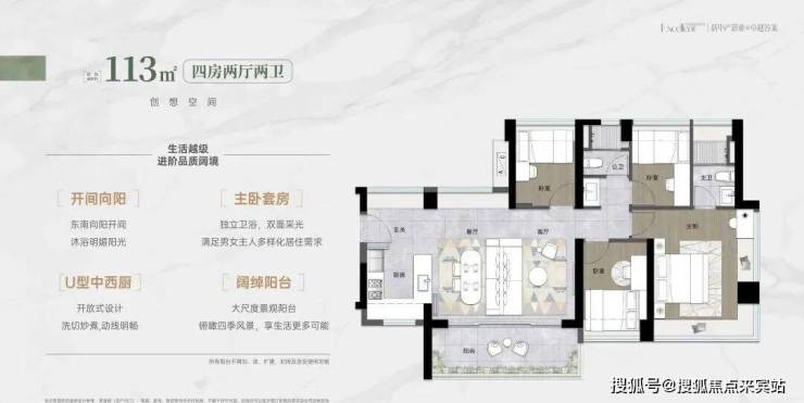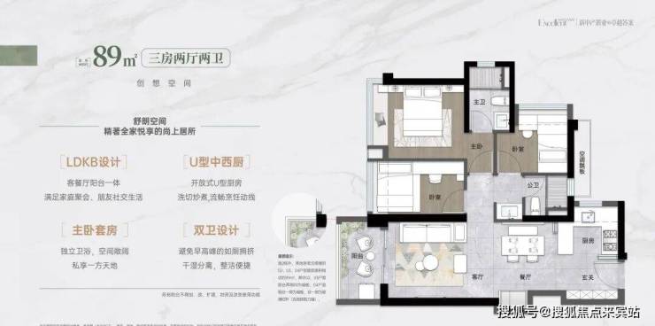 :竖厅格局、U 型厨房、双卫设计、得房率约 92%(含赠送)、西北朝向,总价约420 万起