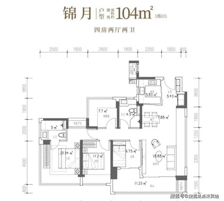 104㎡的4房2厅2卫,设计的是竖厅格局,客厅4.15米开间,LDKB一体化设计,预留冰箱卡槽位,四开间朝南,动静分区,主卧270°无柱转角飘窗还带1个设备平台约1.52平,分别做到了主卧20.34㎡/次卧11.2㎡/次卧7.7㎡/次卧6.75㎡(包含墙体飘窗),U型厨房烟道外置,卫生间干湿分离,得房率约100.71%(包含赠送),客厅连接次卧出大阳台约11.23平,西南朝向。