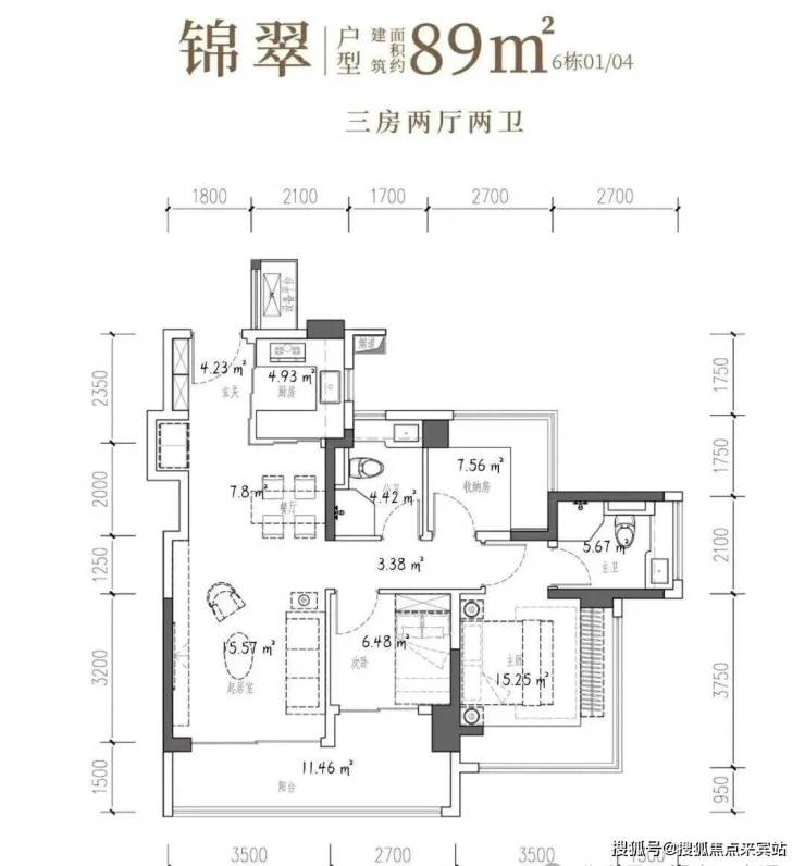 89㎡的3房2厅2卫,6栋02/03户型,设计的是经典竖厅格局,客厅3.5米开间,LDKB一体化,S墙设计预留冰箱卡槽位,三开间朝南,动静分区,主卧+次卧270°无柱转角飘窗,分别做到了主卧15.25㎡/次卧7.56㎡/次卧6.48㎡(包含墙体飘窗),U型厨房烟道外置,卫生间干湿分离,得房率约97.47%(包含赠送),客厅连接次卧出大阳台约11.46平,西南或东南朝向。主要区别在于次卧跟主卫空间。