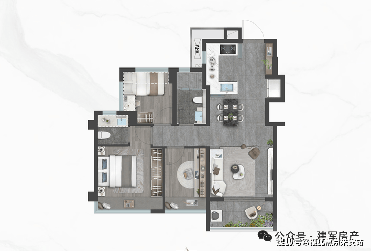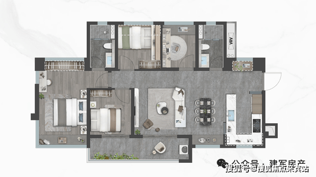 106㎡的4房2厅2卫,设计的是横厅南北通透格局,客餐厅开间5.6米,餐厨一体化,约13.7米超幕视野,超长阳台,主卧转角270°大飘窗,只有2栋07户型才有,得房率:78.99%(不含赠送),阳台主朝西南向。