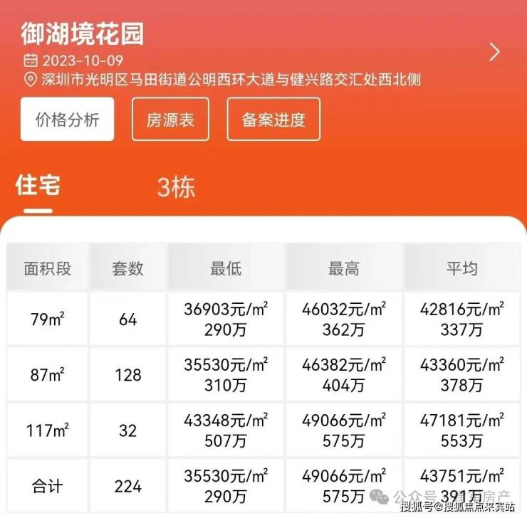 2023年10月9号加推3栋共224套,面积79平-117平,备案均价43843元,备案总价299平-574万。剩余24套,备案了200套,去化率89.29%。