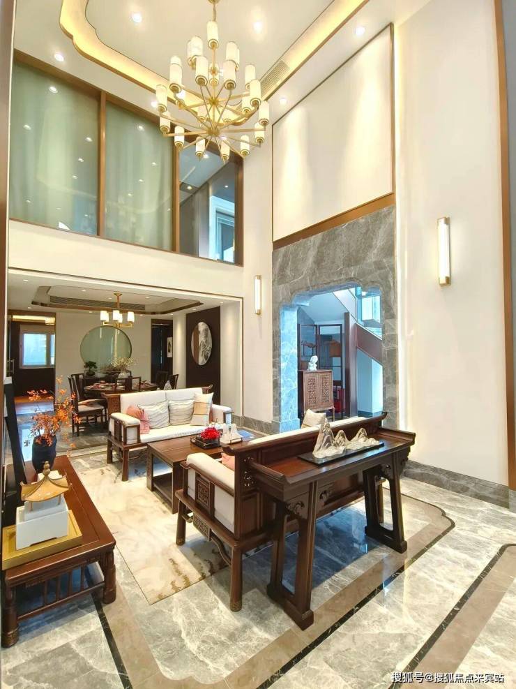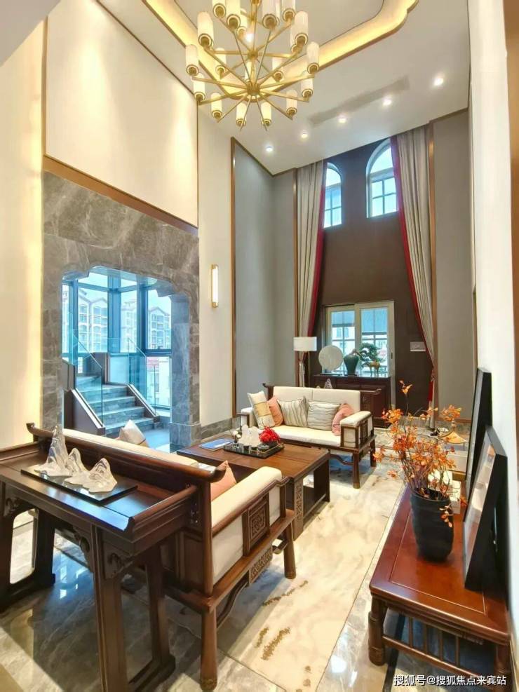 一进门,是挑空客厅,配上中式实木座椅,大气感迎面而来。