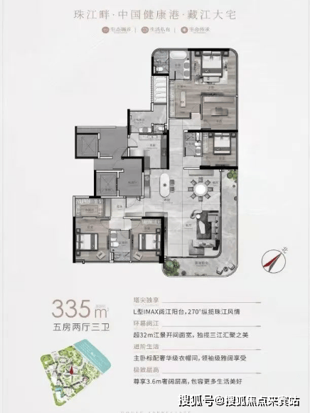 其中,1栋最靠近江边,户型涵盖233㎡/335㎡四房,为三梯两户设计。