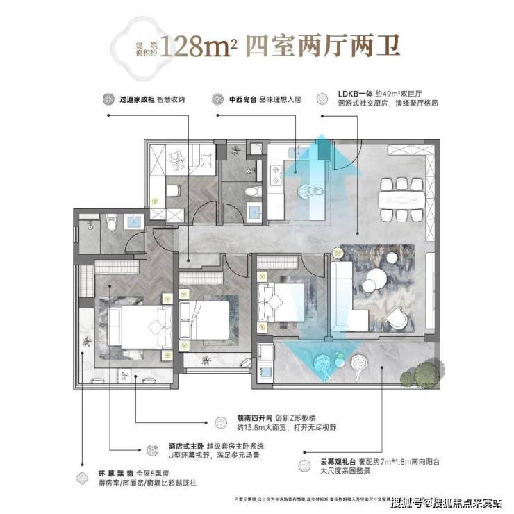建面约128㎡四房:四房朝南,约13.8米的南向采光面,采光相当能打。同时,极致放大主卧套房,搭配L型步入式衣帽间,舒适度和实用度都是高分。