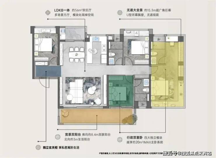 建面约151㎡四房:超64㎡的双巨厅,搭配约8.4米的景观阳台和约3米的生活阳台同时做到三面采光,全屋飘窗总长达约24.1米,属于同类面积段产品罕有的配置。