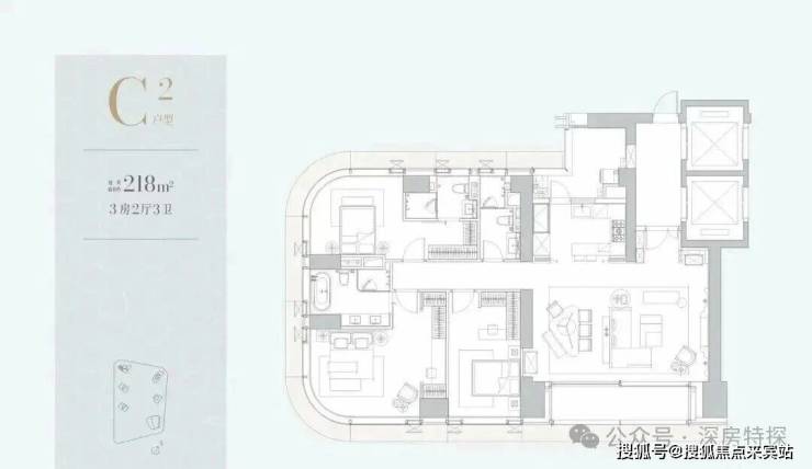 每户都是专梯入户+入户空间。C栋位于小区最里面,东南向户型(218㎡01)会被A、B栋遮挡。