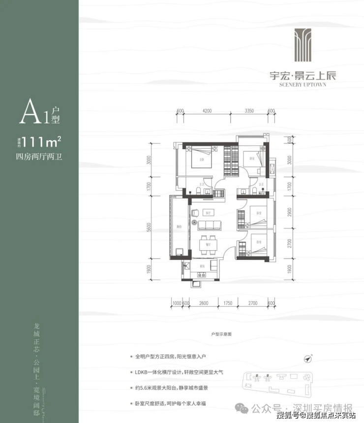 111㎡的4房2厅2卫,设计的是横厅南北通透格局,客餐厅5.6米开间,LDKB一体化,五开间朝南,4个卧室分别做到了3米/3米/2.9米/2.7米的宽度,客厅连接餐厅位出5.6米长的大阳台,L型厨房,公卫生三段式分离,得房率约76%(不含赠送),阳台主朝西南向。