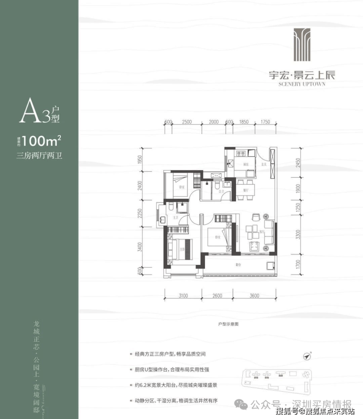 100㎡的3房2厅2卫,设计的是竖厅格局,客厅3.6米开间,LDKB一体化,三开间朝南,3个卧室分别做到了3.1米/2.6米/2.4米的宽度,客厅连接次卧出6.2米长的大阳台,U型厨房,卫生间干湿分离,得房率约76%(不含赠送),东南朝向。