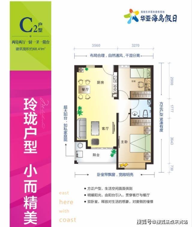 明星户型:68平米精致两房,送1500元/㎡精装、超大阳台、方正紧凑、明厨明卫!