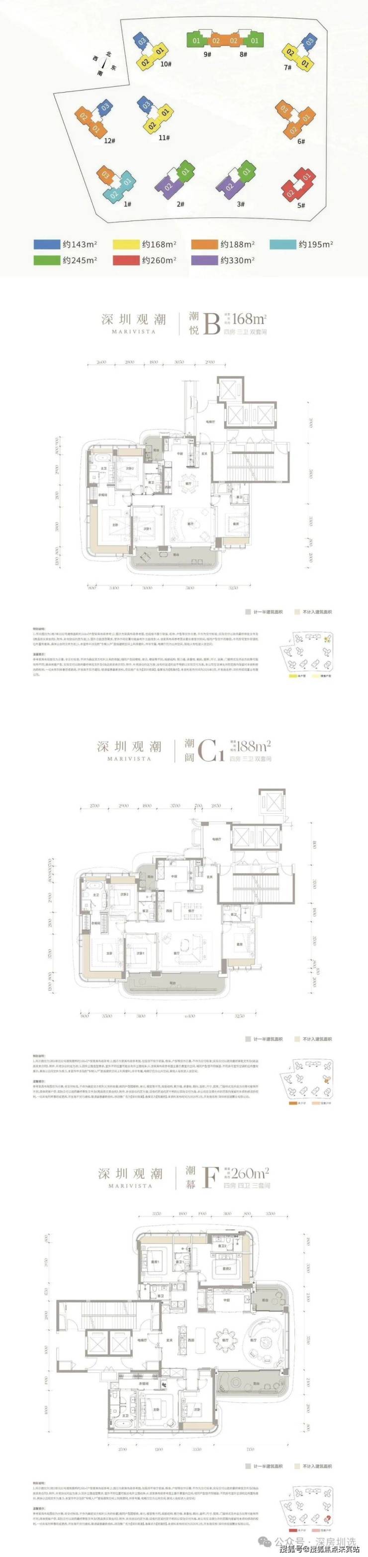 168㎡四房三卫,3梯3户,总价约2200万(13.1万/㎡);188㎡4+1房三卫,3梯3户,总价约2500万(13.3万/㎡);260㎡四房四卫全景舱,2梯2户,总价约4000万(15.4万/㎡);