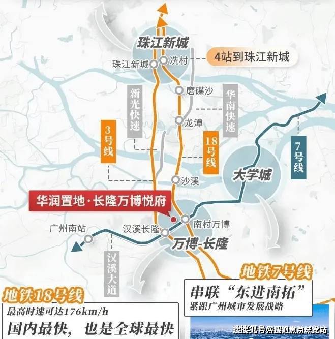 华润长隆万博悦府项目地理位置优越,位于番禺大道和汉溪大道的交汇处,西临长隆度假旅游区,东侧靠近万博商务区。公共交通配套完善,三条地铁线环绕周边,汉溪长隆站距离小区约600米,18号线南村万博站步行距离也在1公里内。周边拥有诸多商业综合体,如万象商业、番禺天河城等,为居民提供丰富的购物和休闲选择。此外,附近还有中央公园、广东宏远体育公园以及长隆欢乐世界和长隆动物园等主题公园和娱乐设施,为居民提供多样化的休闲娱乐活动。