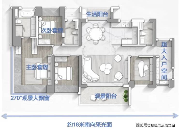 最吸睛的是它的主卧去到28㎡,而且做了约12米长的270°无遮挡U型飘窗,室内光线敞亮,空间通透,非常有豪宅感。