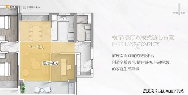这个户型比较特别的是,它灵动性强,可以根据家庭需求变幻横厅、竖厅格局。