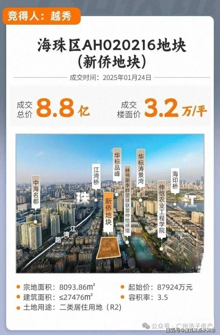 2025年1月24日,广州2025年第一块住宅用地——海珠滨江中AH020216地块,也就是江湾路西边的那块地,也叫新侨地块,被越秀以接近8.8亿的总价、每平方米3.2万的楼面价拿下了