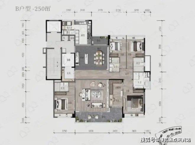 合景臻颐府位于天河智慧城智谷板块南部,是天河核心区稀缺的低密度畔山纯居住社区。项目占地面积约5万平方米,总建筑面积约9.3万平方米,容积率低至2.0,绿地率35%,规划17栋6-11层小高层住宅,总户数仅315户,打造纯粹高端圈层。主力户型为200-350平方米的墅境大平层,采用三梯两户设计,层高3.5米,部分户型配备专属工人电梯及超大观景阳台。交付标准为国际一线品牌豪华装修,物业费每月10.29元/平方米,由合景旗下宁骏物业提供金钥匙管家服务。