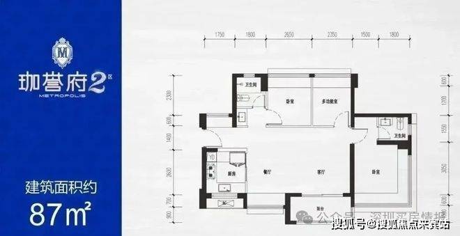 87平米,设计的是横厅南北通透格局,客餐厅6.2米开间,3个卧室分别为3.3/2.65/2.35米的宽度,主卧270°环幕飘窗视野,U型厨房,得房率:77.54%(不含赠送),阳台进深1.7米,主朝东南朝向。