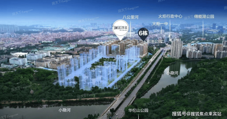 项目坐拥片区两大绿肺——华佗山公园和得能湖公园。华佗山公园占地38万㎡、得能湖公园占地16万㎡,是火炬区大型的主题绿化休闲公园。项目东面、南面、北面三面临河(北面:八公里河;东南面:小隐涌)。