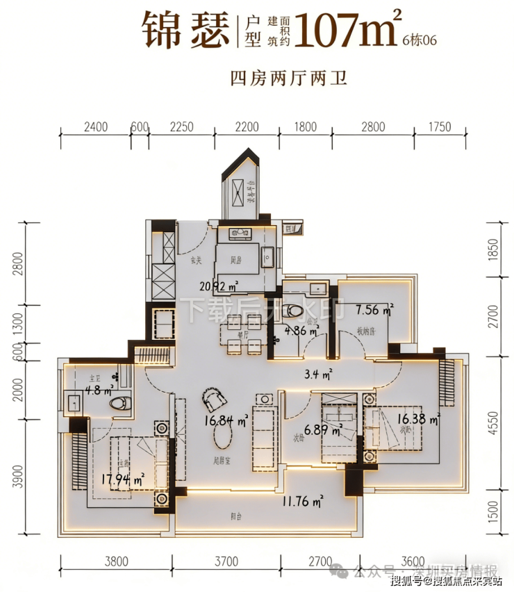 项目主打建面约 89-130㎡精装 3-4 房,全系遵循大面宽、南向采光、动静分区设计,搭配 270° 无柱转角飘窗与超大景观阳台,得房率高达 97.47%-104.06%,空间实用性拉满。