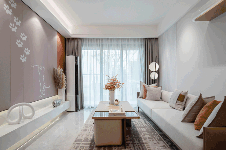 94㎡的猫咪主题样板间,整体风格简约温馨,构建一猫二人三餐四季的生活场景。