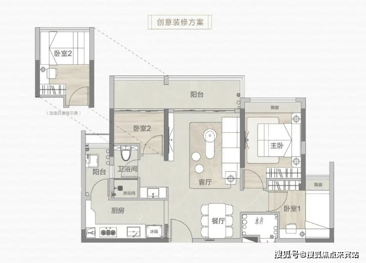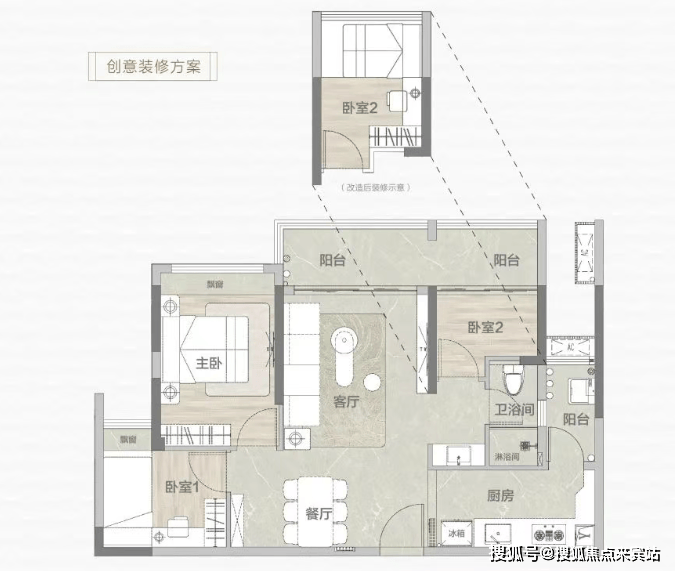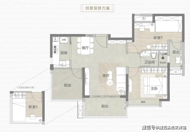 建面约85㎡三房两厅一卫,阳台空间扩容,功能增加,大餐厅舒适布局。