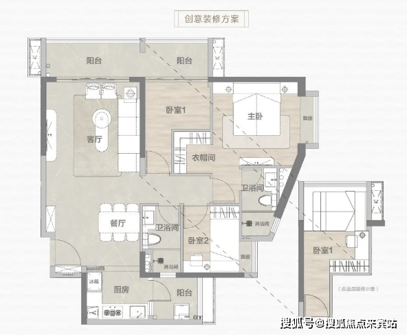 建面约106㎡三房两厅两卫,大方厅宽约3.8米,主卧独立衣帽间,收纳梳妆并然有序。