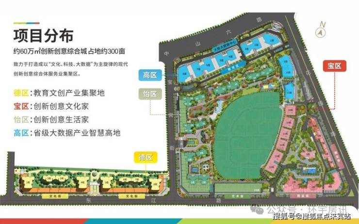 【 综合城 】项目由德、宝、怡、高四个功能版块组成,将产业、商业、人居相互融合,整体划分为德宝怡高商务区和生活区。