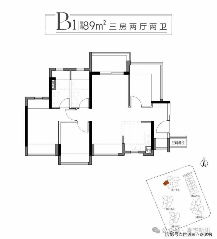 二:建面约89平方B1B2户型三房两厅两卫