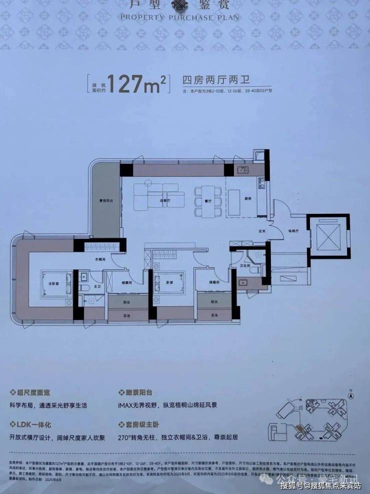 将地标高度/创新设计/极致景观/自然融合四大要素集于一体,约150米地标建筑以45°错位转体设计,实现四户分踞四角的独立瞰景布局,每户均可享有极致山海景观。约55米超宽楼间距、0.6的黄金窗墙比远超常规住宅0.3-0.5的标准,呈现山景、海景、花园三重景观界面。