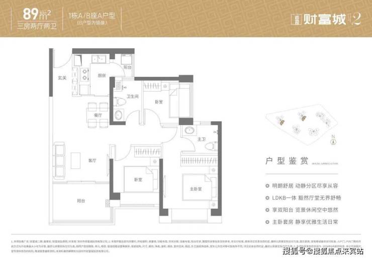 约89㎡:3房2卫,竖厅+主卧套房,动线清晰,收纳体系完善,适合首改/改善家庭;