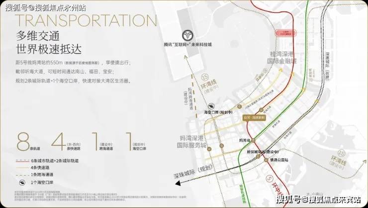 周边共规划6条地铁线、2条城际轨道、1条妈湾跨海隧道及1个海空口岸。
