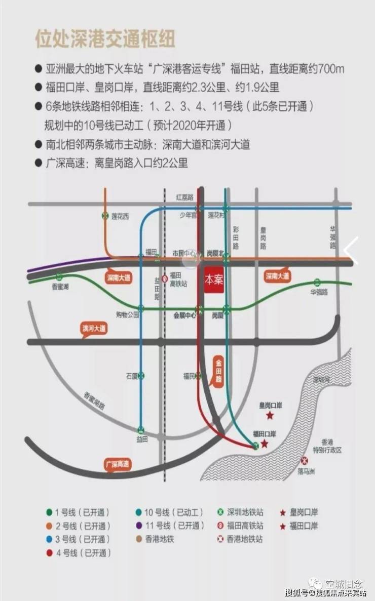 路网交通,连通4条地铁线(其中10号线在建)、4个地铁站(会展中心、市民中心、岗厦、岗厦北),其中2个地铁站为大型换乘站点。