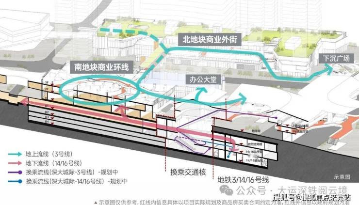 深铁阅云境广场,作为大运交通枢纽上盖物业,总占地面积约5.66万㎡,总建筑面积约51万㎡,以龙飞大道为界共分南北2期开发,有空中连廊相连,北区建设住宅小区,南区兼顾了公共性和便捷性,主要规划超高层办公写字楼和大型商业mall。地处大运枢纽核心地段,也是东部中心首个满足复杂性成熟+商业逻辑的大型TOD综合体项目。