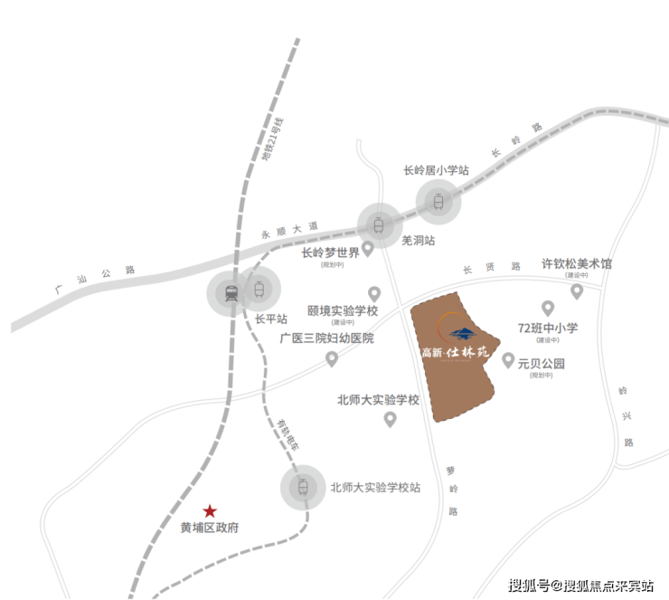 直线距离约800米地铁21号线长平站,1站黄埔区府(水西站)、2站万达广场(苏元站)、5站到天河(天河智慧城站);步行约400米有轨电车1号线羌洞站,1站换乘21号线。5大城市主脉