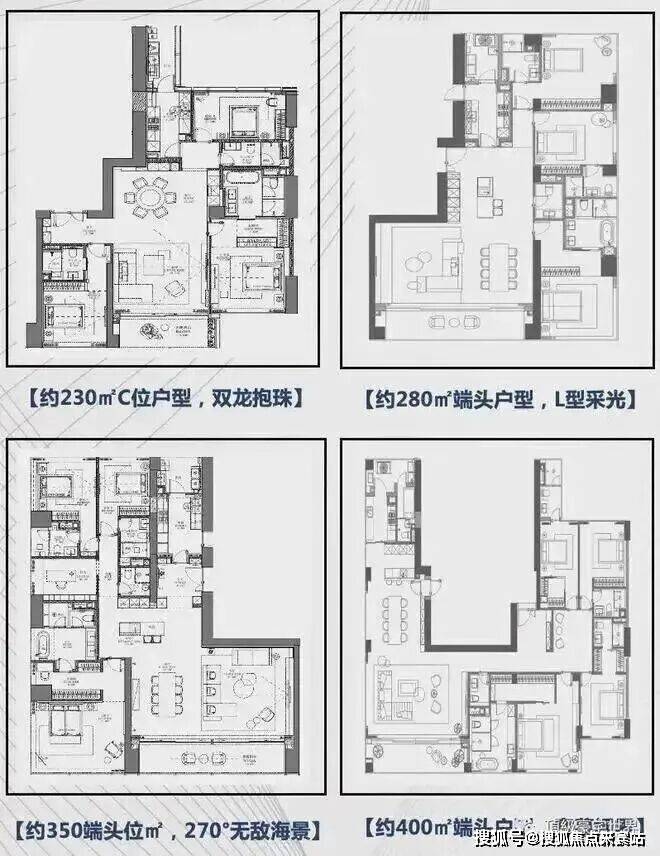 户型信息:主力户型为建面约230 - 700㎡的环海大平层,部分户型支持定制整层约2100㎡的户型,具体有建面232㎡的 1室1厅1卫、建面400㎡的 4室3厅5卫、建面500㎡的5室3 厅6卫以及建面700㎡的6室3厅7卫等多种户型。
