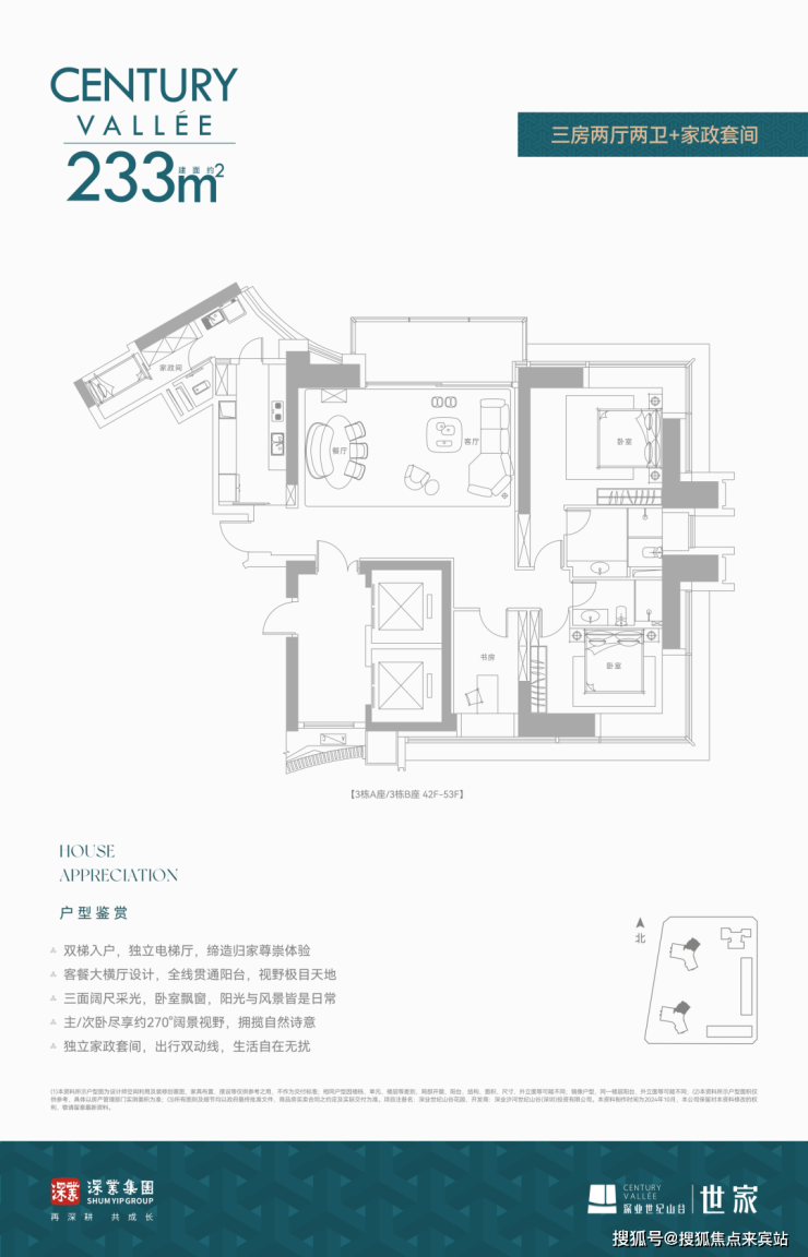 233㎡3+1房:总价2280-2600万。双梯独立入户,7.9米大横厅,主次卧270°环幕飘窗,看高尔夫果岭景观。