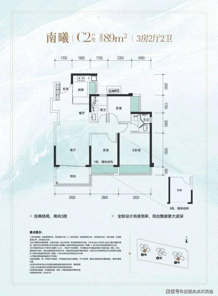 89㎡的3房2厅2卫(C1户型),设计的是经典竖厅格局,进门入户玄关,客厅3.5米开间,S墙设计预留冰箱卡槽位,三开间朝南,3个卧室分别做到了3.2米/2.8米/2.35米的宽度,U型厨房,卫生间干湿分离,得房率约:81.39%(不含赠送),西南朝向。