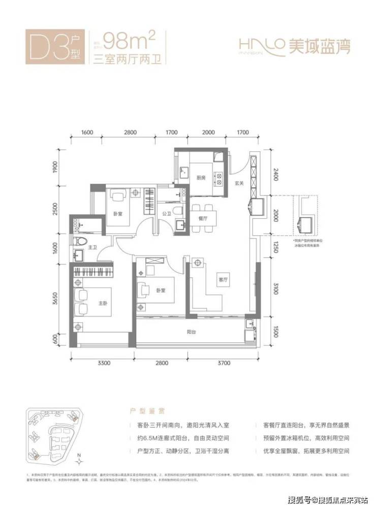 98㎡的3房2厅2卫,D3户型,设计的是经典竖厅格局,客厅3.7米开间,LDKB一体化设计,S墙设计预留冰箱卡槽位,动静分区,客厅连接次卧出6.5米长的大阳台约9.75m²,U型厨房,卫生间干湿分离,得房率约80.12%(不含赠送),东南朝向。