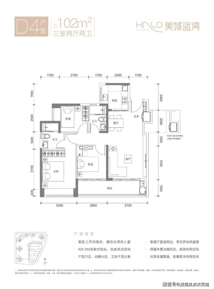 102㎡的3房2厅2卫,D2户型,设计的是竖厅南北通透格局,进门入户玄关,客厅3.7米开间,LDKB一体化设计,S墙设计预留冰箱卡槽位,动静分区,客厅连接次卧出6.4米长的观景大阳台约9.6m²,U型厨房,卫生间干湿分离,得房率约80.11%(不含赠送),西南或东北朝向。