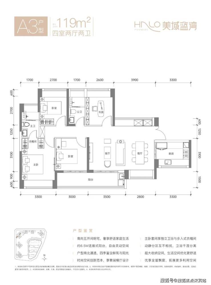 119㎡的4房2厅2卫,A3户型,设计的是横厅南北通透格局,进门入户玄关,客餐厅6.3米开间,LDKB一体化设计,五开间朝南,客厅连接次卧出6.5米长的观景大阳台约9.75m²,U型厨房,卫生间干湿分离,得房率约80.12%(不含赠送),阳台主朝东南向。建筑面积95.34m²+赠送面积18.07m²=实用面积113.41m²,加上赠送得房率95.3%。
