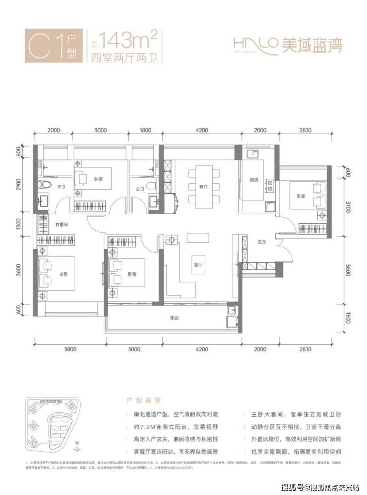 143㎡的4房2厅2卫,C1户型,设计的是竖厅南北通透格局,进门独立入户玄关,客厅4.2米开间,五开间朝南,客厅连接次卧出7.2米长的巨幕大阳台约10.8m²,U型厨房,卫生间干湿分离,得房率约77.13%(不含赠送),阳台主朝正南向,俯瞰整个小区园林景观。