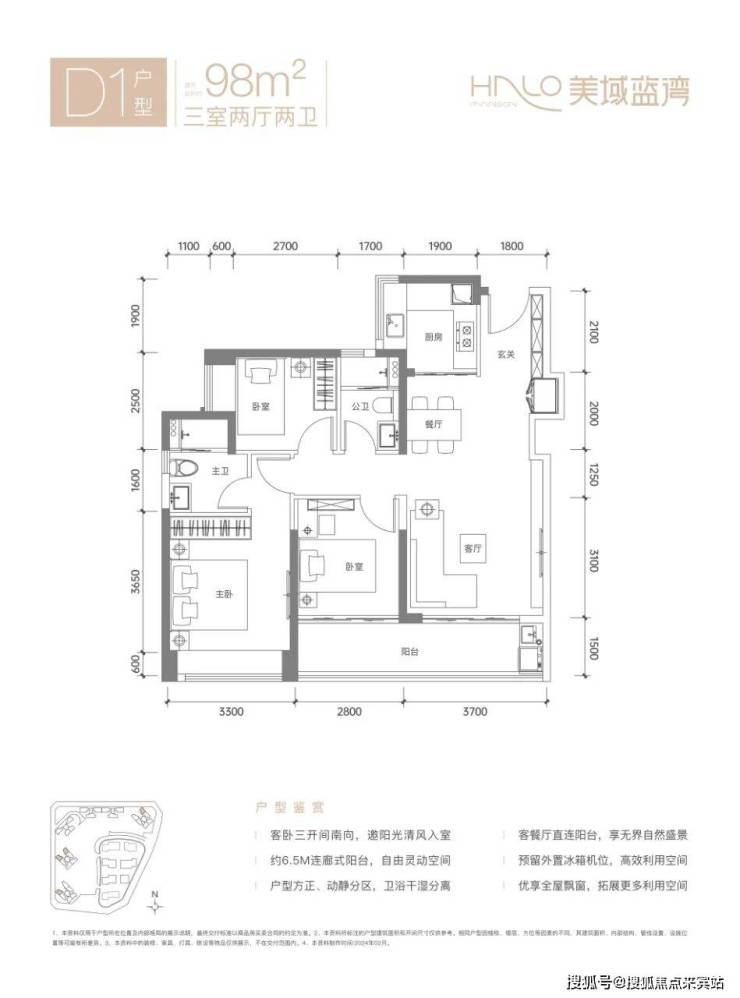 98㎡的3房2厅2卫,D1户型,设计的是经典竖厅格局,客厅3.7米开间,LDKB一体化设计,S墙设计预留冰箱卡槽位,动静分区,客厅连接次卧出6.5米长的大阳台约9.75m²,U型厨房,卫生间干湿分离,得房率约80.12%(不含赠送),西南或东北朝向。