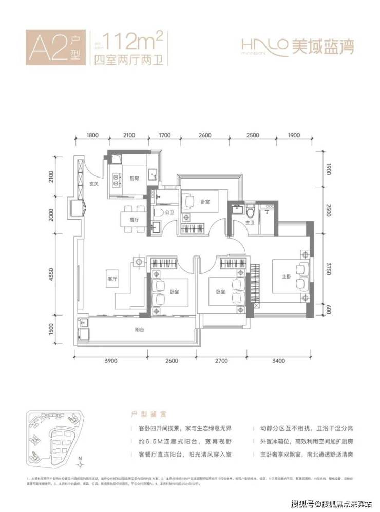 112㎡的4房2厅2卫,A2户型,设计的是竖厅南北通透格局,进门入户玄关,客厅3.9米开间,LDKB一体化设计,S墙设计预留冰箱卡槽位,动静分区,客厅连接次卧出6.5米长的大阳台约9.74m²,U型厨房,卫生间干湿分离,得房率约80.12%(不含赠送),西南或东北朝向。